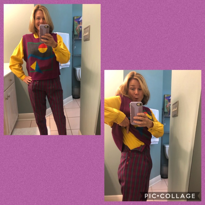 Of course, I needed the perfect outfit for this special occasion. My cousin, Marcy, worked at Brothers on the Blvd, a trendy chic clothing store. She was always happy to see me walk through the doors $$$ (Thanks Mom & Dad for the credit card!). But hey, it was worth the money because this snazzy outfit is still in great shape. YES, of course I kept it! Since way back in the stone ages we didn’t document our every move nor have social media (THANK GOD!), here’s the stylish outfit today. It still fits to a certain extent. Keeping it real though, and showing both angles. AHHH.
