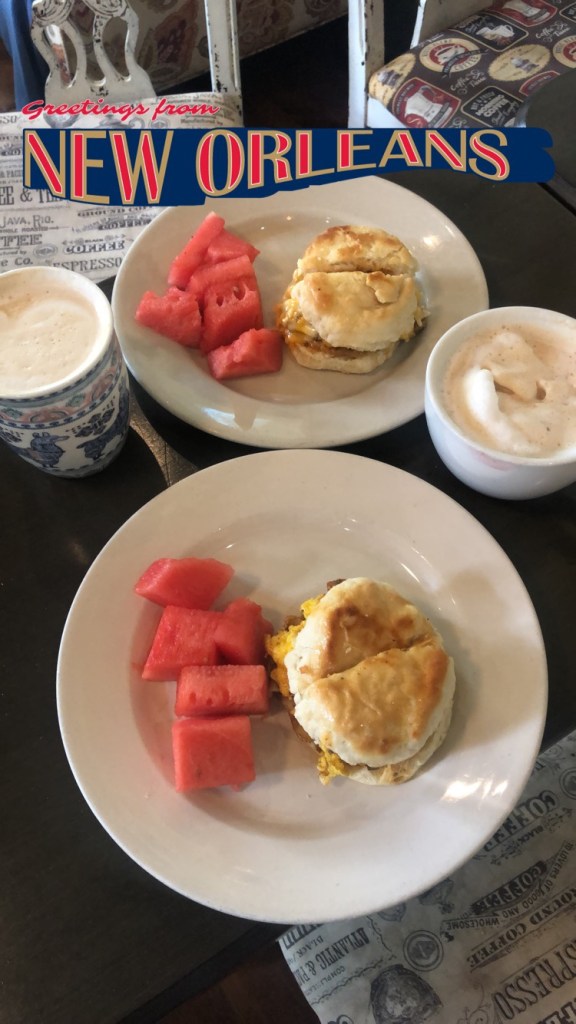 Sunday morning we tried another new place, Fatma’s Cozy Corner. Yep, you guessed it!!! We rode our bikes there ☺️ There’s nothing like morning time in New Orleans. The streets were empty and quiet after the hustle and bustle of a Saturday night. At Fatma’s we enjoyed cappuccino, latte, and the biscuit sandwiches that came with a side of watermelon πŸ˜‹ Super friendly staff and we enjoyed visiting with the other customers. It lives up to its name – COZY!
