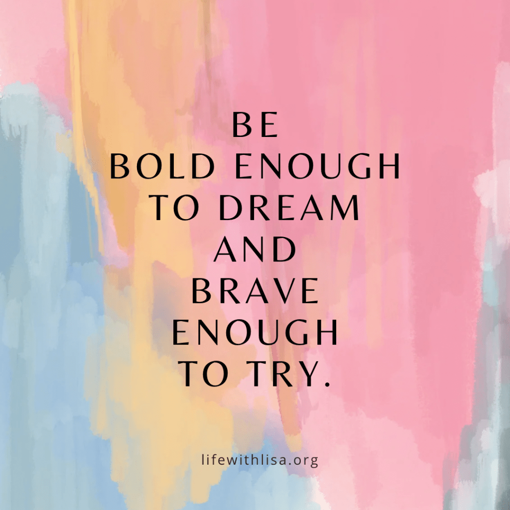 January 6, 2024 by lifewithlisa9 Bold & Brave If you had a freeway billboard, what would it say? Imagine ~ Believe ~ Achieve Life With Lisa Share this: Click to share on Facebook (Opens in new window) Facebook More Click to share on X (Opens in new window) X Like Loading...